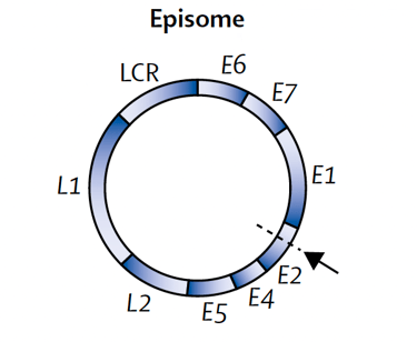 En el subgrupo de infecciones por VPH que conducen a la transformación maligna, el ADN viral suele integrarse en el genoma del huésped. La carcinogénesis se asocia con la expresión de las proteínas E6 y E7, que inactivan los supresores tumorales p53 y la proteína del retinoblastoma (pRb), respectivamente (Fig 1)(2).