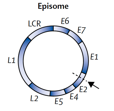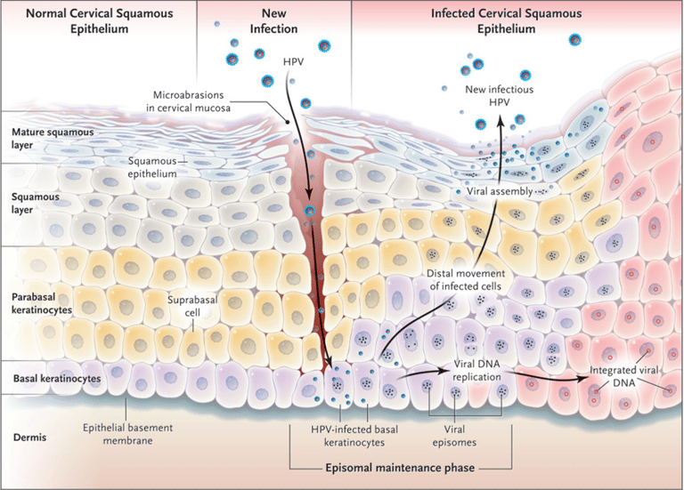El virus del papiloma humano (VPH) es un virus de ADN, que causa el 99.7% de los casos de cáncer de cérvix. Las infecciones por el VPH son comunes y se transmiten por contacto directo mediante microabrasiones de la piel o la mucosa, infecta los queratinocitos basales, donde el virus se amplifica a aproximadamente 50-100 copias por célula. El ADN viral se mantiene separado del ADN del huésped como un episoma (en una fase de mantenimiento episomal). Las células basales infectadas ingresan al compartimento suprabasal, donde se desencadena la expresión abundante de genes tempranos y tardíos, que lleva a una amplificación del genoma a un alto número de copias en los compartimentos de diferenciación terminal. El ensamblaje viral ocurre en la capa superior del epitelio escamoso, y los viriones se liberan y pueden infectar el tejido adyacente. Por este mecanismo de infección y replicación, las respuestas inmunitarias innatas y adaptativas a la infección natural son limitadas, y aunque la mayoría de las infecciones se controlan eventualmente, las concentraciones de anticuerpos tienden a ser bajas o indetectables (Fig 1)(2).